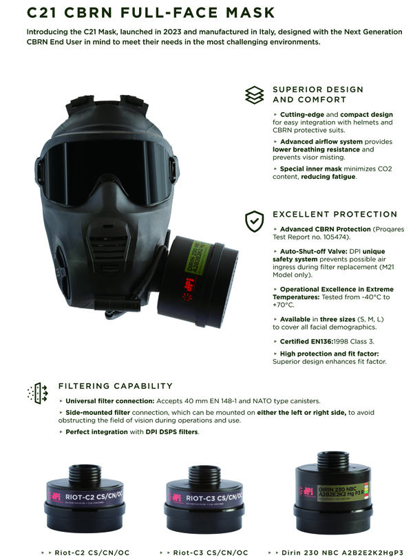 全面罩符合UNI EN 136(CL3),並與STANAG螺紋篩檢程式相容。它對各種有毒工業化學品提供出色的保護,並在與特定的組合篩檢程式一起使用時提供 CBRN 保護。