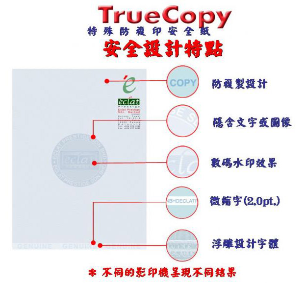 防止文件偽造的有效解決方案。 可以防止未授權的複製,此安全紙張本身有有多項的安全機制 。 要加強文件安全性,使用多項安全機構是非常重要的。 讓閱讀者或文件收件者可以判別是否是正本的文件。